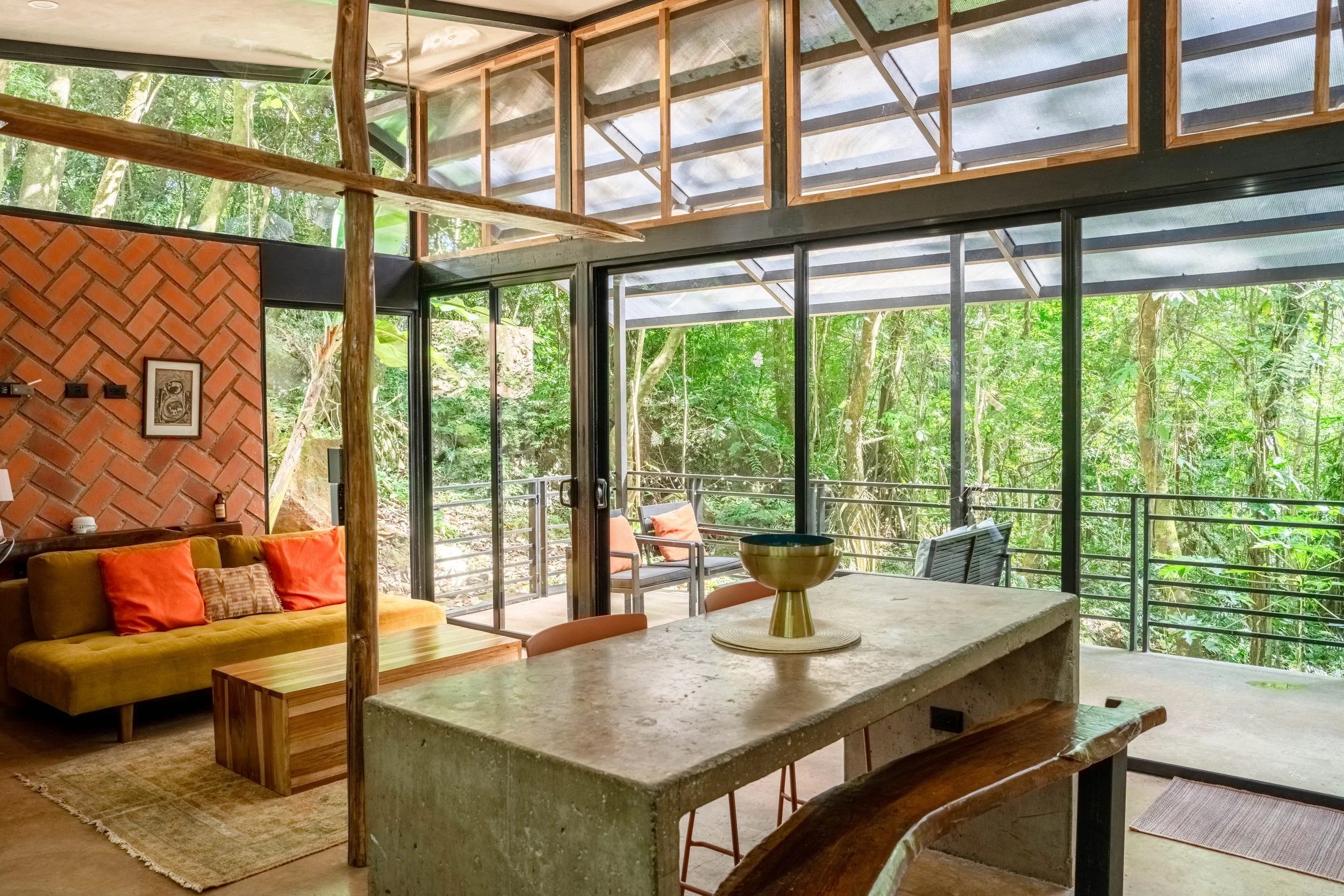 A spacious jungle-facing terrace provides room for dining, lounging, or relaxing in the shade of the surrounding canopy. A second, more private terrace offers additional outdoor space for quieter moments. A private trail leads to a secluded freshwater creek, ideal for swimming or cooling off on warm days. Wildlife such as monkeys, toucans, and tropical birds are commonly seen on and around the property.